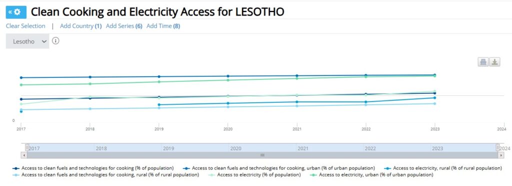 These clean cooking goals are integrated into Lesotho’s broader climate and energy strategy. The country aims to improve energy efficiency by 20%, increase household electricity access from 35% in 2015 to 50% by 2030, and expand renewable energy capacity by 200 MW, including wind, solar, and hydropower. Lesotho’s Second NDC (2024–2030) reaffirms energy-sector mitigation as a top priority, signaling a sustained commitment to clean energy access and climate resilience. Together, these targets reflect a national effort to reduce reliance on biomass, improve air quality, and align with global climate goals through sustainable energy solutions.